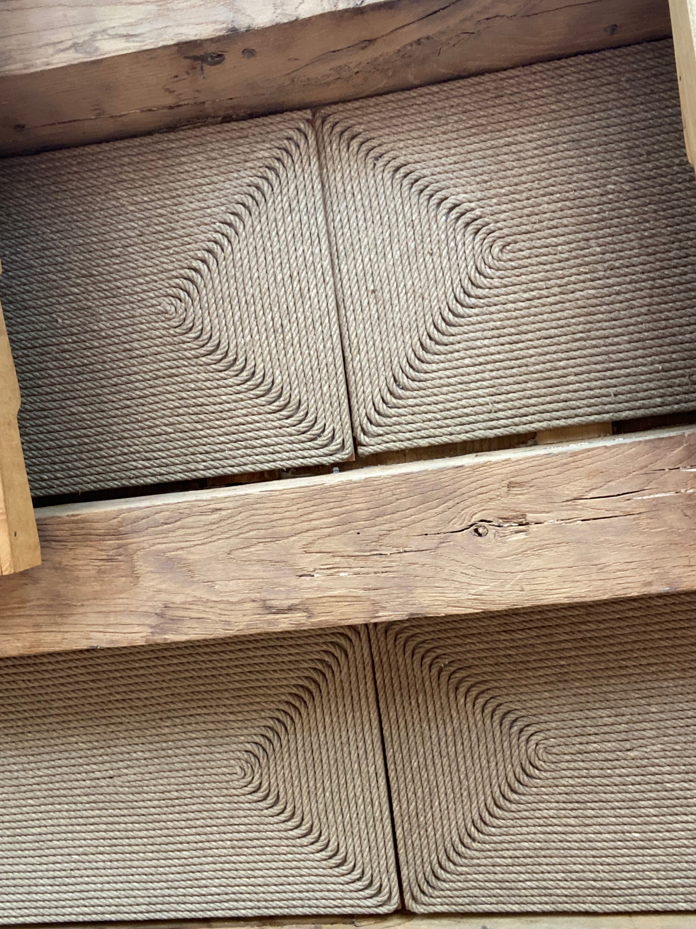 Deux Clefs ceilings with rope art between the beams by artist Christian Astuguevieille. Bayonne, France. Photo By Regina Sinsky-Crosby.
